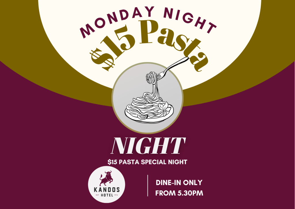 Monday Pasta Night – $15 🍝 Big bowls, bold flavours and unbeatable value. Your new Monday ritual at Kandos Hotel.