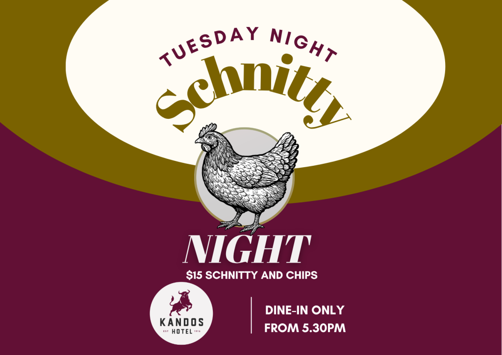 Tuesday Schnitty Night – $15 🍗 Golden, crunchy schnitty & chips — done right. Easy, satisfying and worth showing up for.