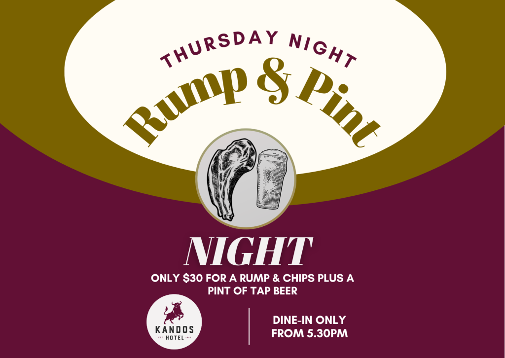 Thursday Rump & Pint Night – $30 🥩🍺 A proper pub feed — rump, chips & a cold pint. Hearty, classic and made for Thursdays.