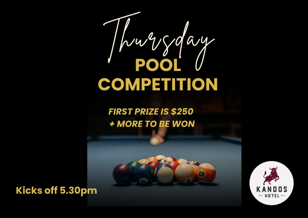 Thursday Pool Comp 🎱 $250 starting pot — kicks off from 5:30pm. Grab a cue, sink a few and take your shot.